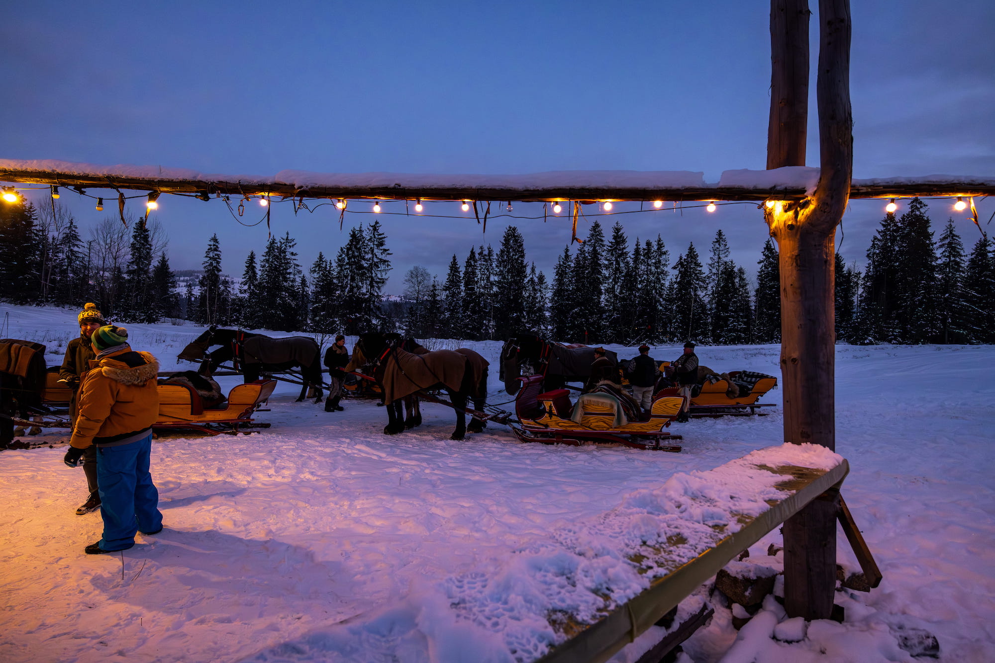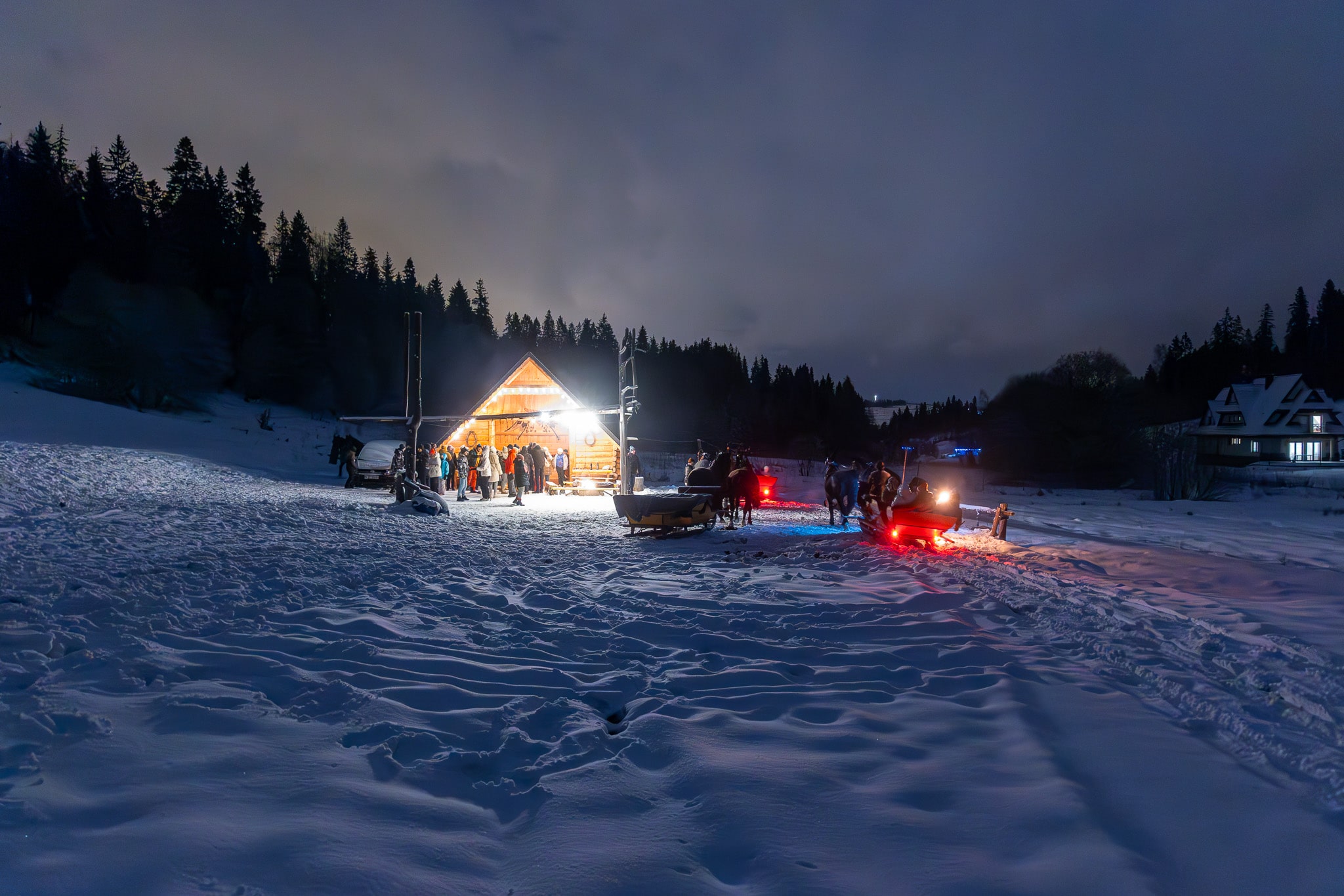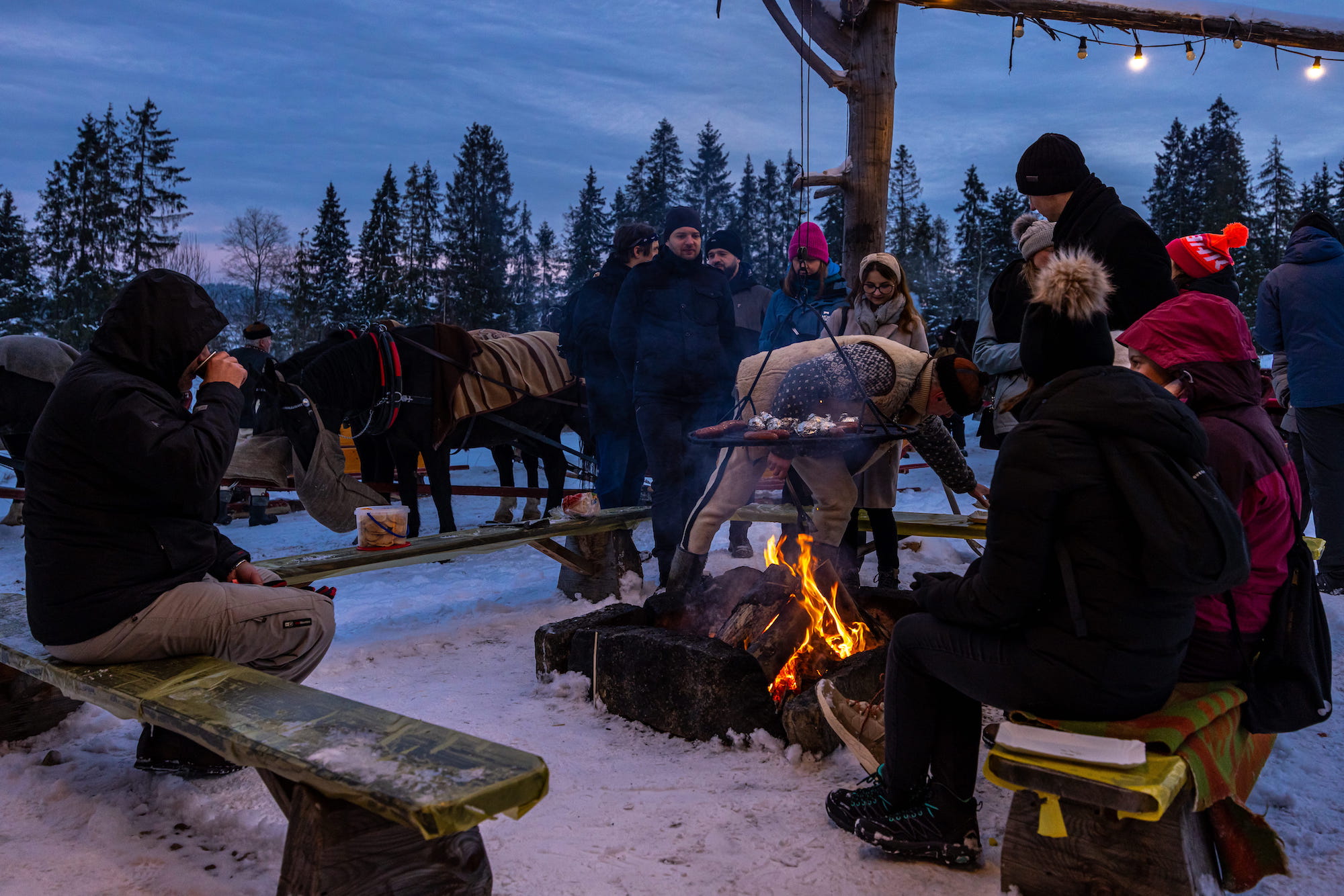 Przekonaj się, jak wyglądają nasze zimowe atrakcje – sanie z pochodniami, bajkowe krajobrazy i ognisko w góralskim stylu.
